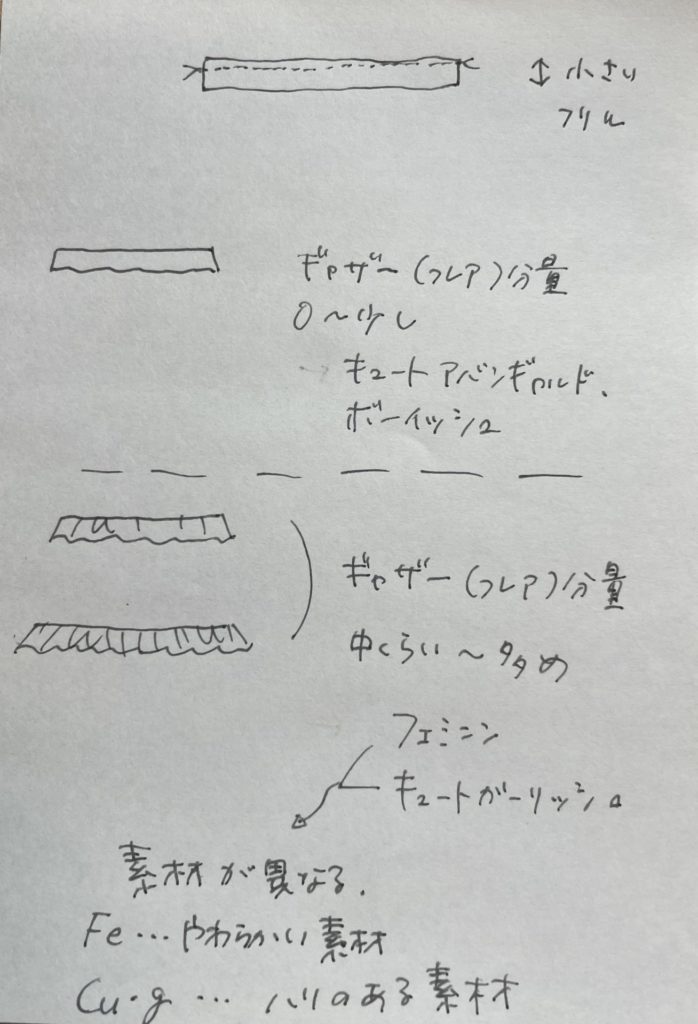 【フリル】これは素材によっても雰囲気がだいぶ変わります(素材は大事)。そしてギャザーとフレアまとめてかいてますが、フレアのほうが大人っぽく感じることが多い。