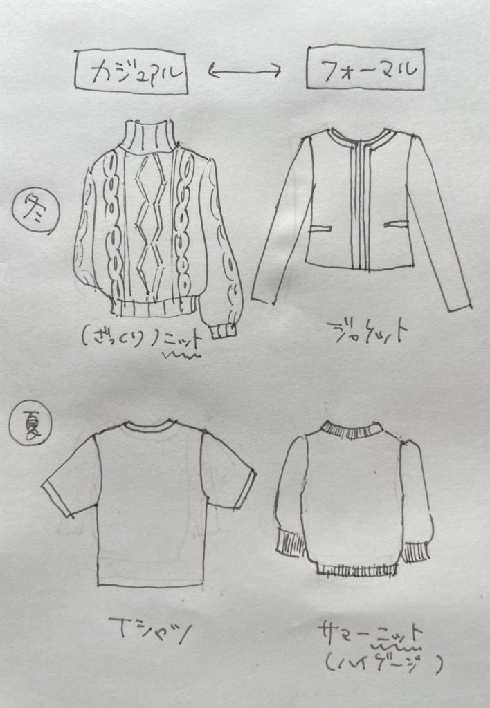 【相対的】先日のニットのポストは冬物を想定していました。サマーニットはまた違いますね。冬物だと(ジャケットなどと比べると)ニットはカジュアル。ですがサマーニットは(Tシャツなどと比べると)きちんと感。ニットは冬物はざっくり、夏物はハイゲージが多いのも関係しそう。